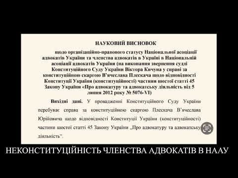 НАУКОВИЙ ВИСНОВОК щодо організаційно-правового статусу Національної асоціації адвокатів України та ЧЛЕНСТВА АДВОКАТІВ в Україні в Національній асоціації адвокатів України: «Загалом, можна стверджувати, що положення шостої частини статті 45 Закону України "Про адвокатуру та адвокатську діяльність", яке передбачає ОБОВ'ЯЗКОВЕ та беззастережне ЧЛЕНСТВО ВСІХ АДВОКАТІВ України в Національній асоціації адвокатів України (НААУ), дійсно ПРИЗВОДИТЬ ДО ПОРУШЕННЯ конституційного права на свободу об'єднання та не бути членом об'єднання громадян (частини перша і четверта статті 36 Конституції України). Це ОБМЕЖЕННЯ права на свободу об'єднання, яке покладає на адвокатів додаткові обов'язки у зв'язку з реалізацією цього конституційного права, встановлене в імперативній формі законом. Закон, у свою чергу, має бути доступним, передбачуваним і сформульованим з достатньою точністю, а також переслідувати легітимні цілі. Проте такі законодавчі ОБМЕЖЕННЯ конституційного та конвенційного права людини НЕ ВІДПОВІДАЮТЬ вимозі бути потрібними у демократичному суспільстві, тобто НЕ ОБУМОВЛЕНІ нагальною суспільною потребою, та НЕ ВІДПОВІДАЮТЬ принципу пропорційності.» (Джерело http://surl.li/yvpuys).